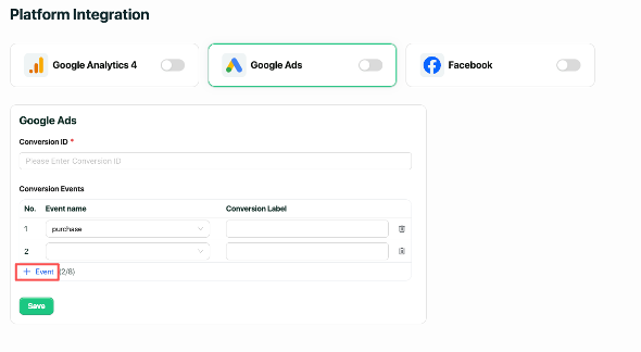 Step 5. Click “+ Event” and repeat Step 3–Step 4 to add additional events if needed.