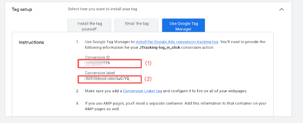 Copy the Conversion ID (1) and Conversion Label (2),and paste them into the corresponding fields in JTracking.