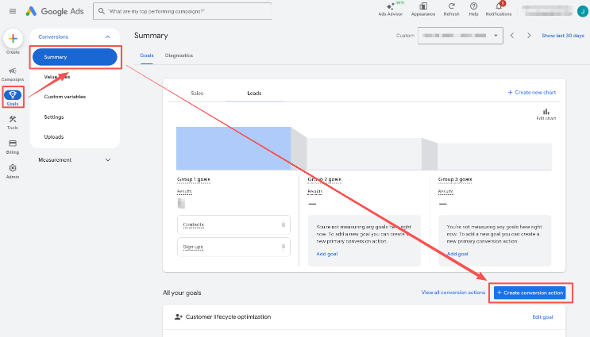 Step 1. Log in to your Google Ads account. Go to Goals → Summary → Create conversion action.