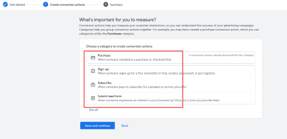 Step 3. Choose a conversion category (e.g., Purchase or another relevant option).