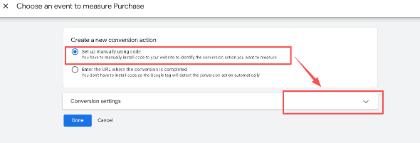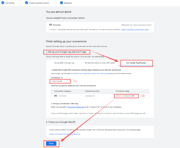 Step 3. Copy the Conversion ID (1) and Conversion Label (2), then paste them into the corresponding fields in JTracking.