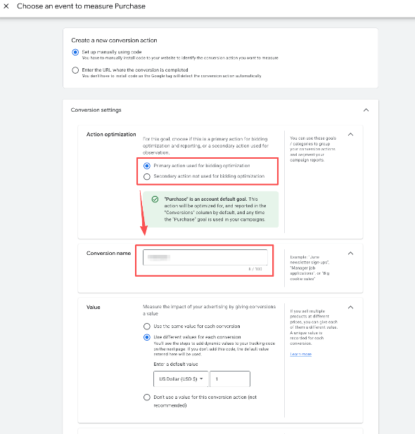 - Adjust settings such as Action optimization or Conversion name if needed